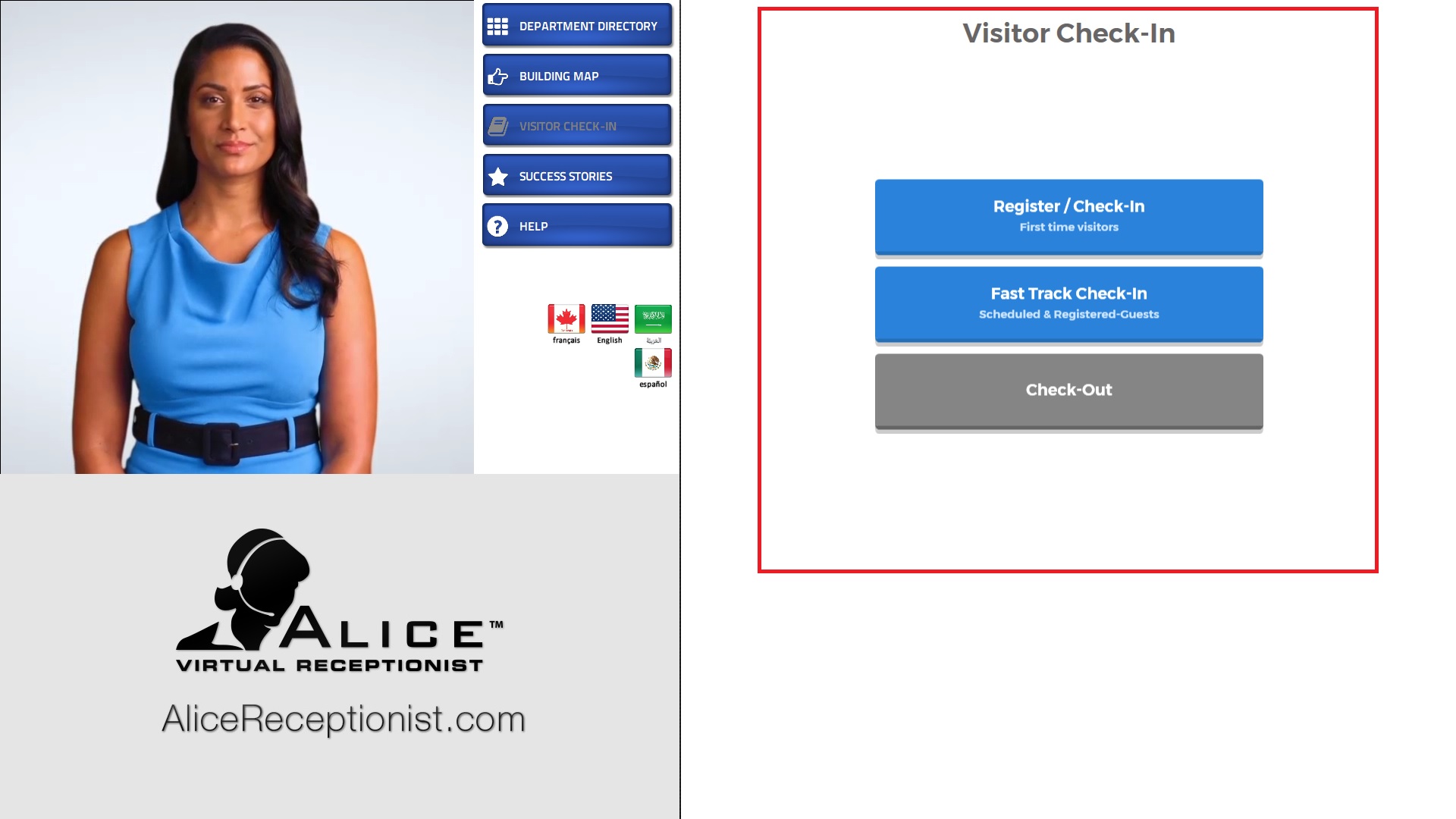 The ALICE Visitor Management (AVM) application for visitor check in., provides a way for visitors to check in and check out of a building using the ALICE Receptionist system. The visitor can either use "Register / Check-in" for first or one time visits, or the "Fast Track Check-in" if they are a registered visitor or have an appointment. Once the visitor completes the process, their host may be informed through a notification message, and a badge will be printed for the visitor.