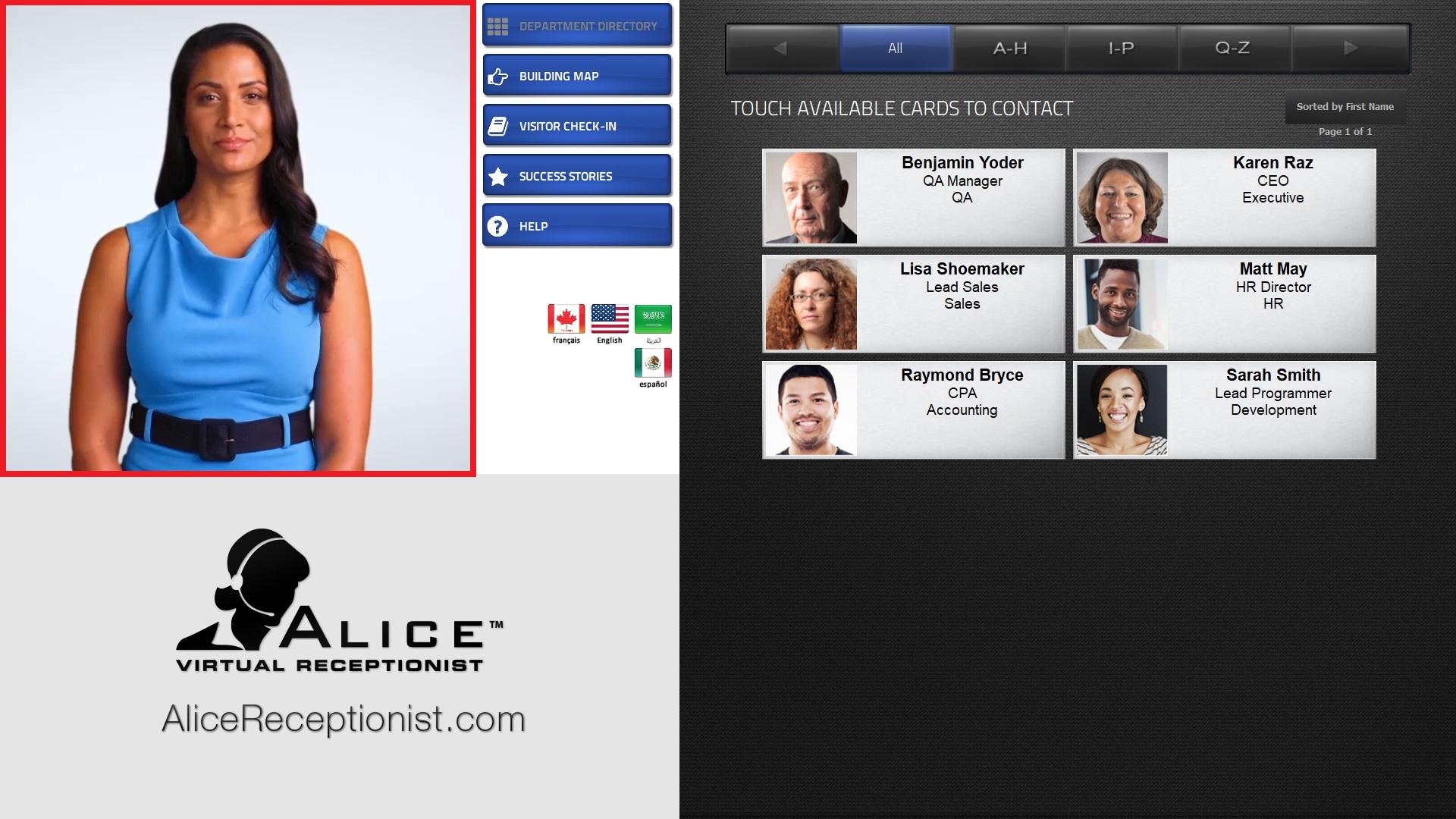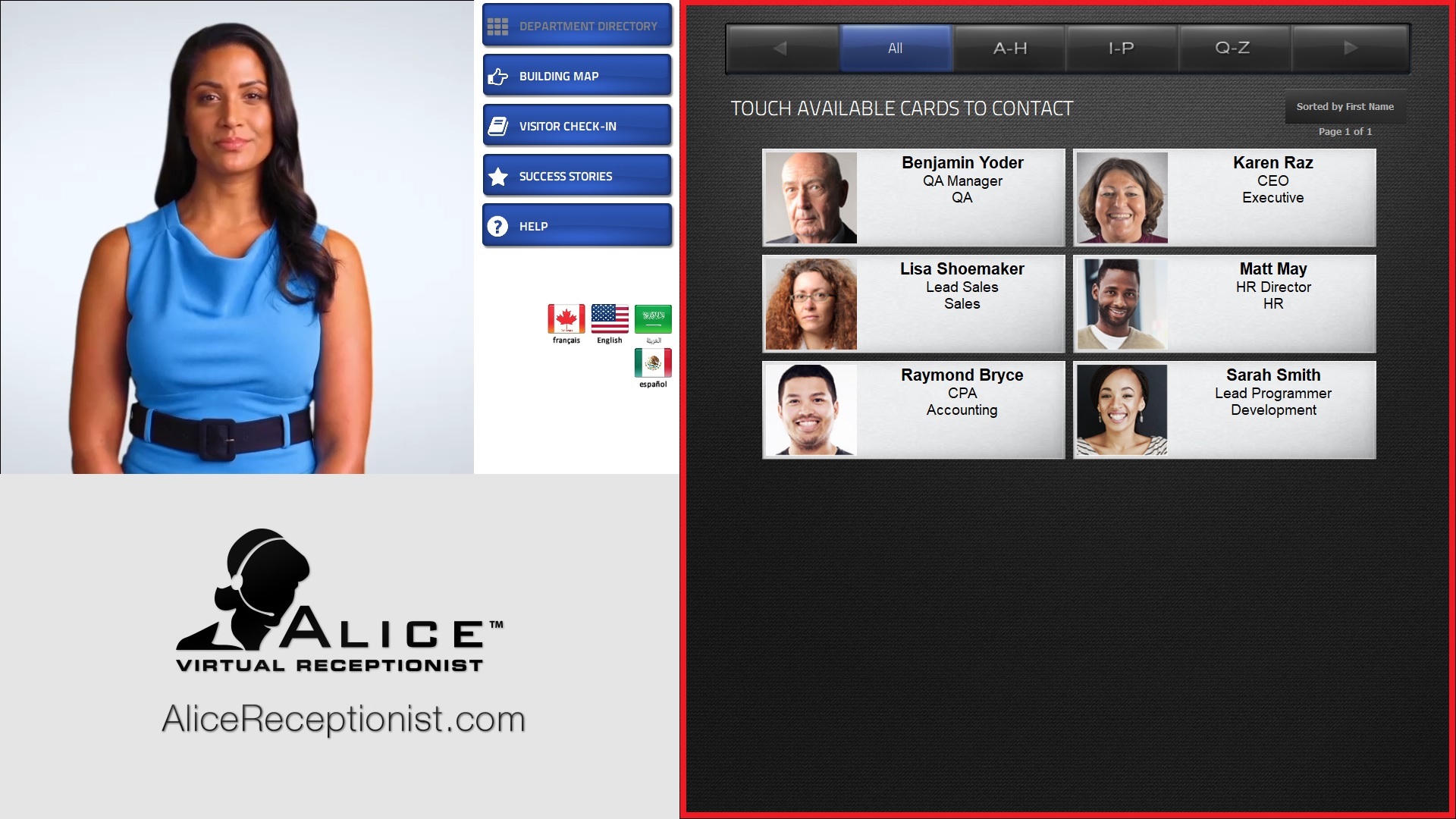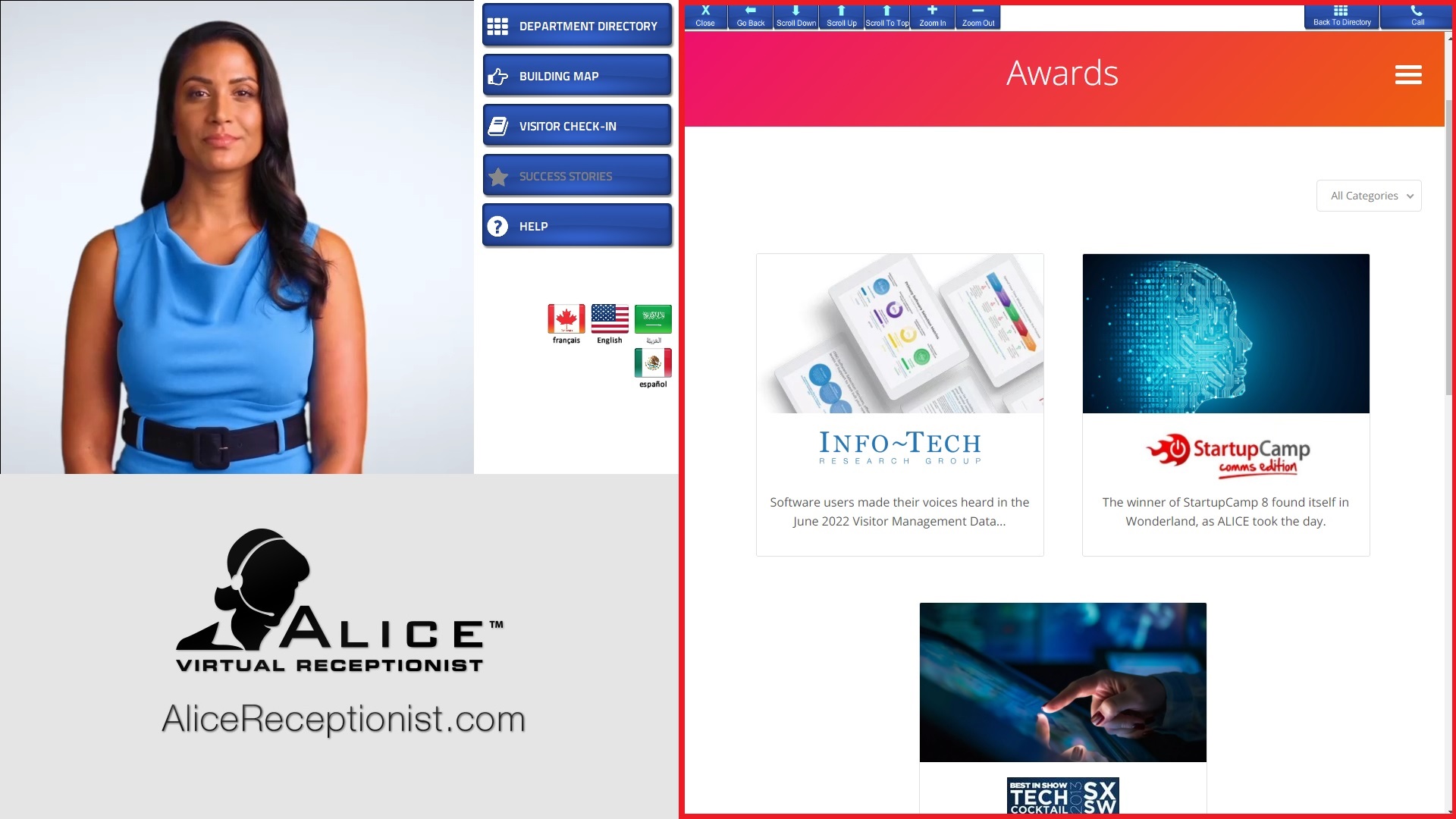 The ALICE interface that appears on the ALICE Kiosk in your Lobby, also known as the ALICE Receptionist Directory) is the most advanced office lobby greeting system with extensive features and options. Using the ALICE Receptionist system, visitors can...