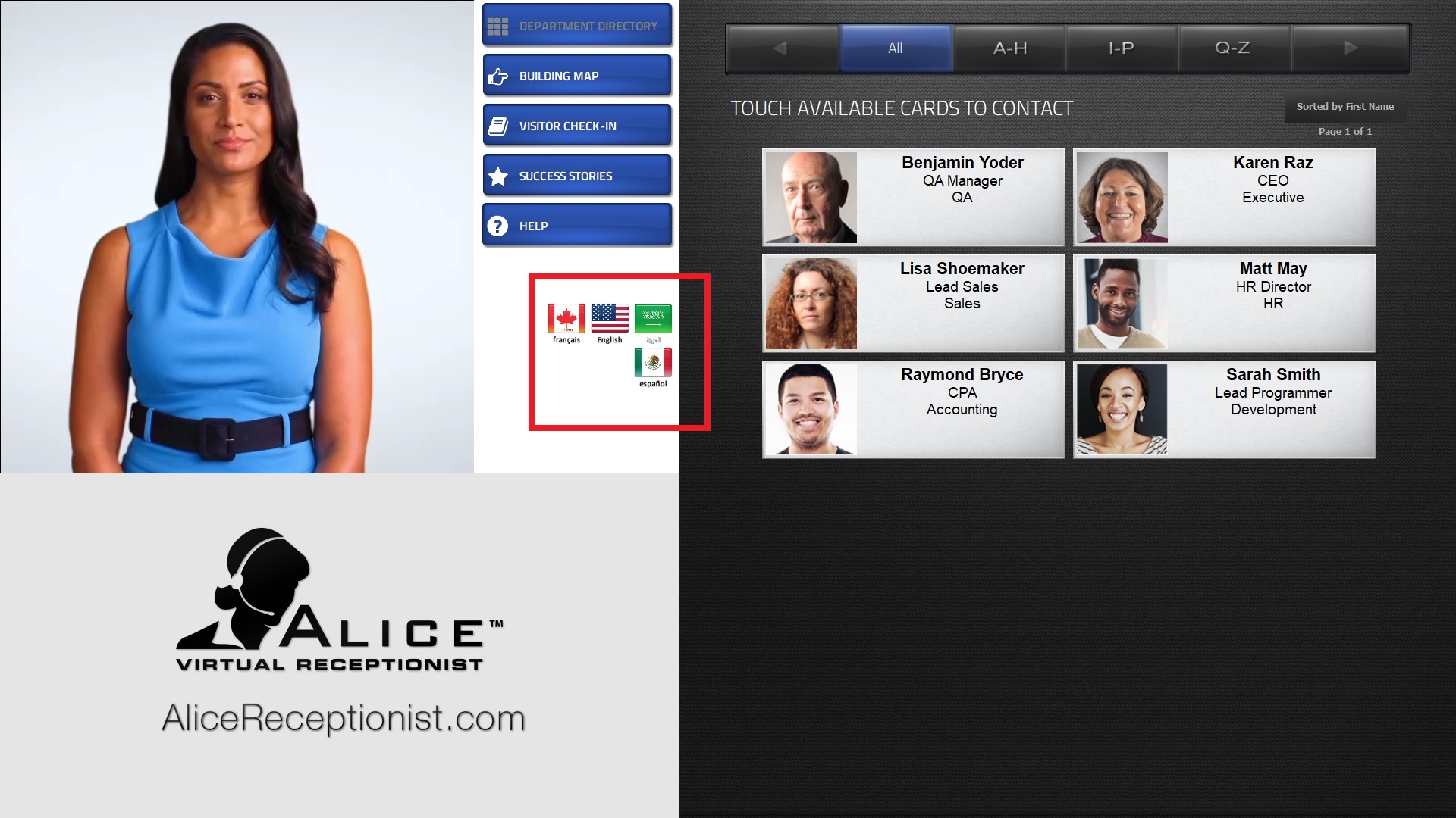 Visitors can select which language they would like to use when interacting with the ALICE Receptionist system. Selecting one of the available flags will change the spoken language of the ALICE Receptionist avatar and translate the user interface. After a set period of time, the ALICE Directory interface will return the system's default language.